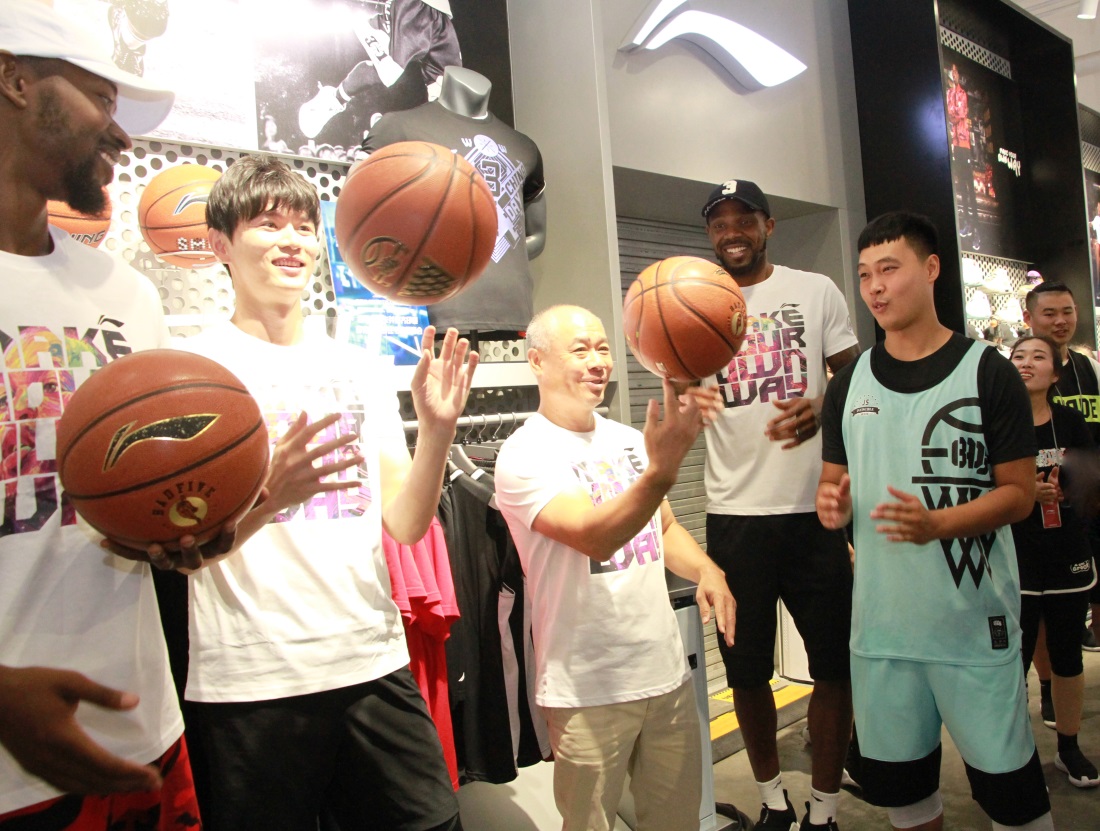 | 图片说明 | 李宁品牌创始人、董事长李宁先生,羽毛球世界冠军鲍春来先生及NBA“韦德之队”重量级球星现场体验指尖转球 |