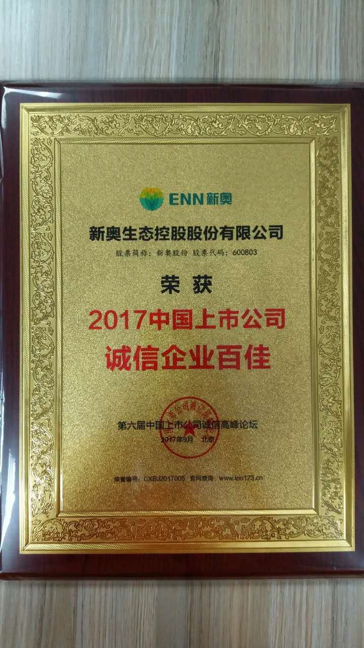 新奥股份荣获“2017中国上市公司诚信企业百佳”奖牌