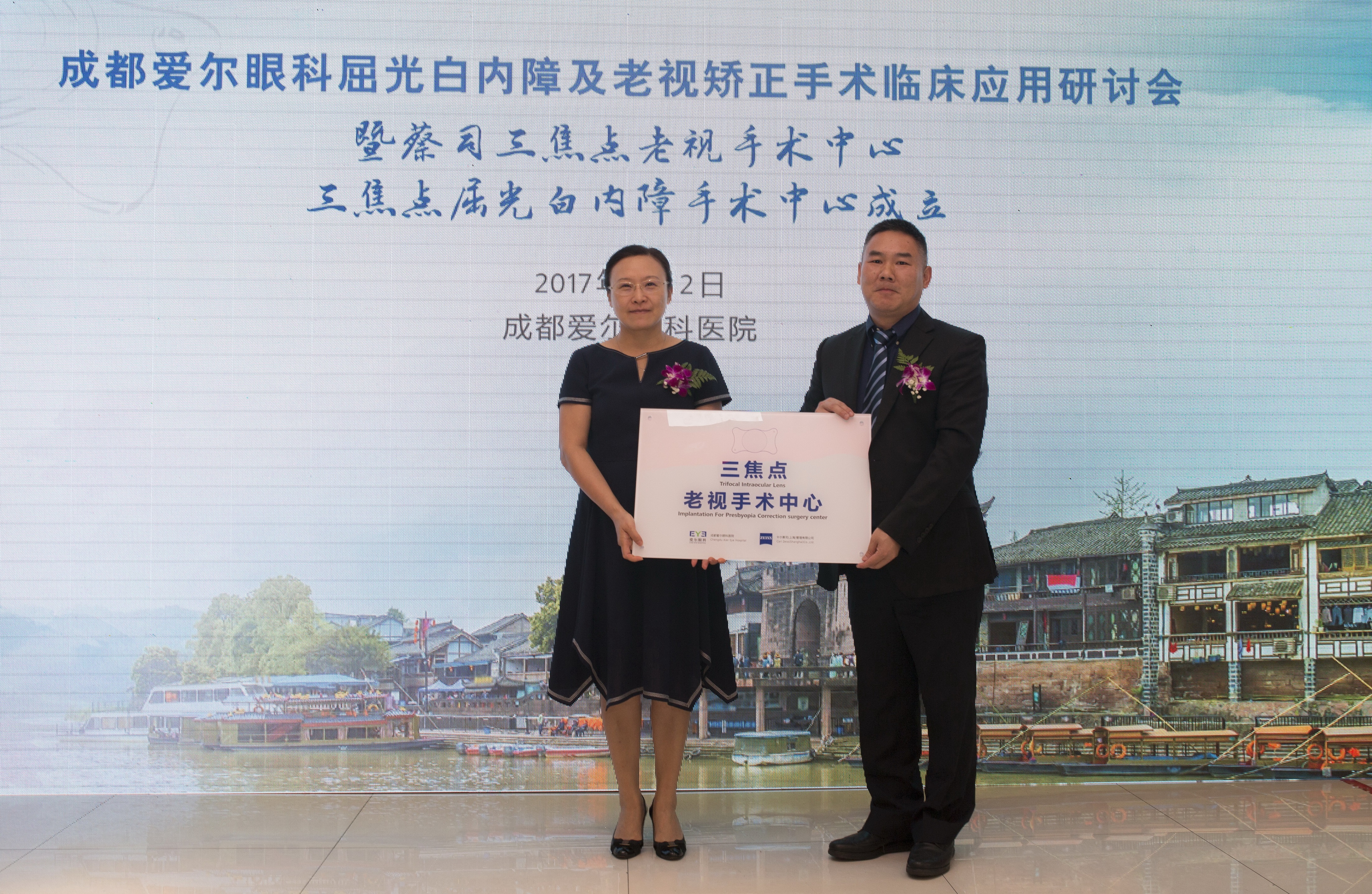 成都爱尔眼科医院院长周进女士(左)与卡尔蔡司大南西区区域销售经理赵聘先生(右)共同为三焦点老视手术中心揭牌
