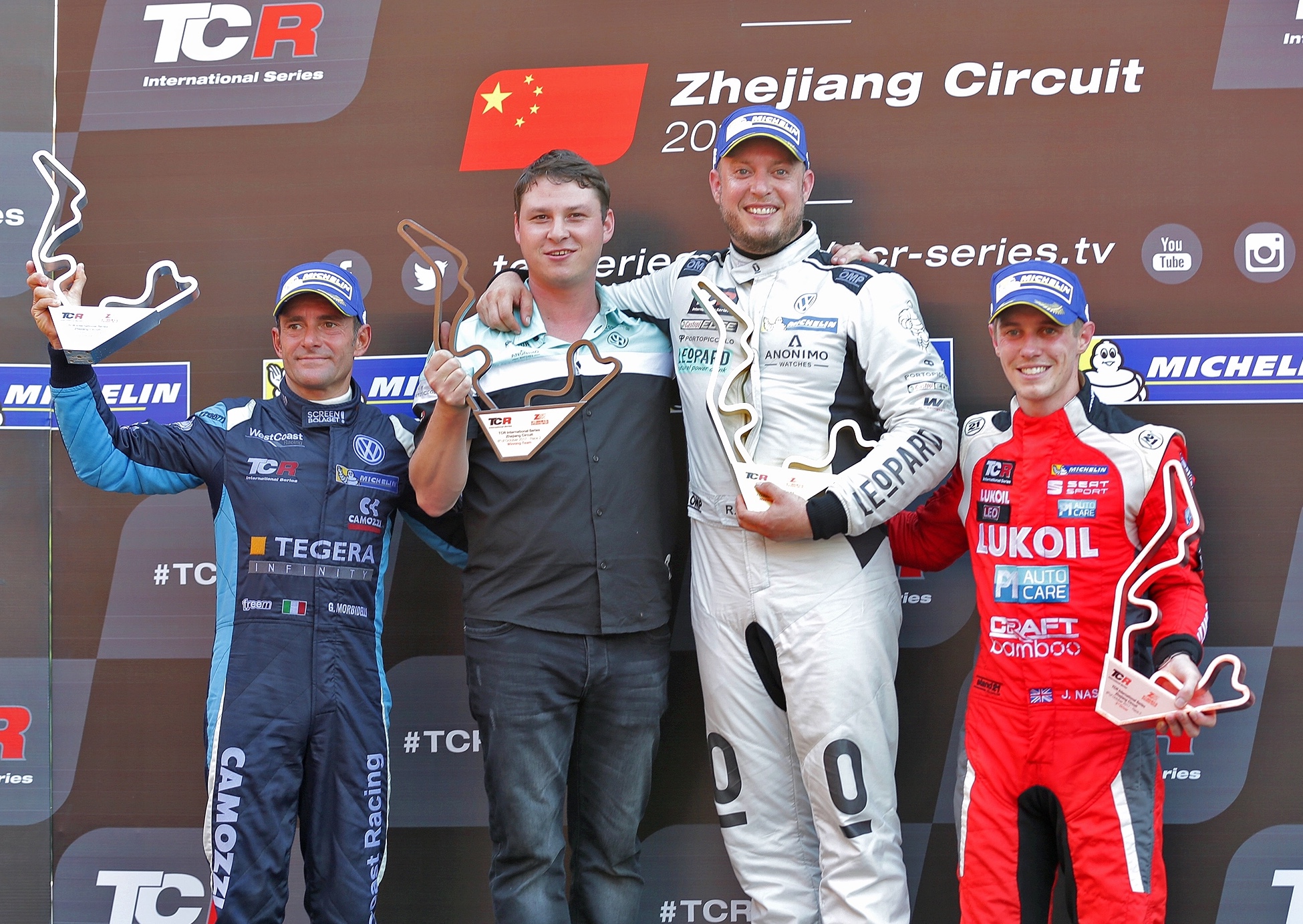 | 图片说明 | 2017 TCR国际系列赛中国站第二回合正赛获奖车手合影(从左至右):亚军车手Gianni Morbidelli,冠军车队代表Leopard Racing车队,冠军车手Rob Huff和季军车手James Nash |