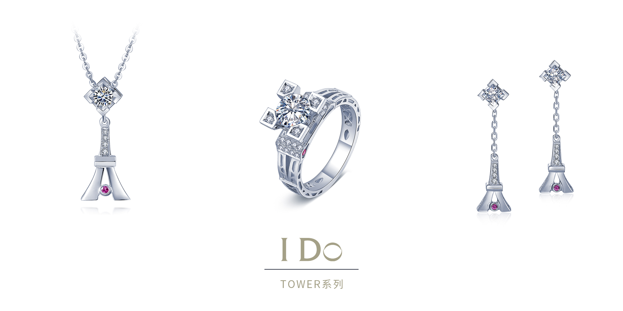 I Do Tower系列吊坠项链、戒指及耳饰,白金镶钻石及红宝石