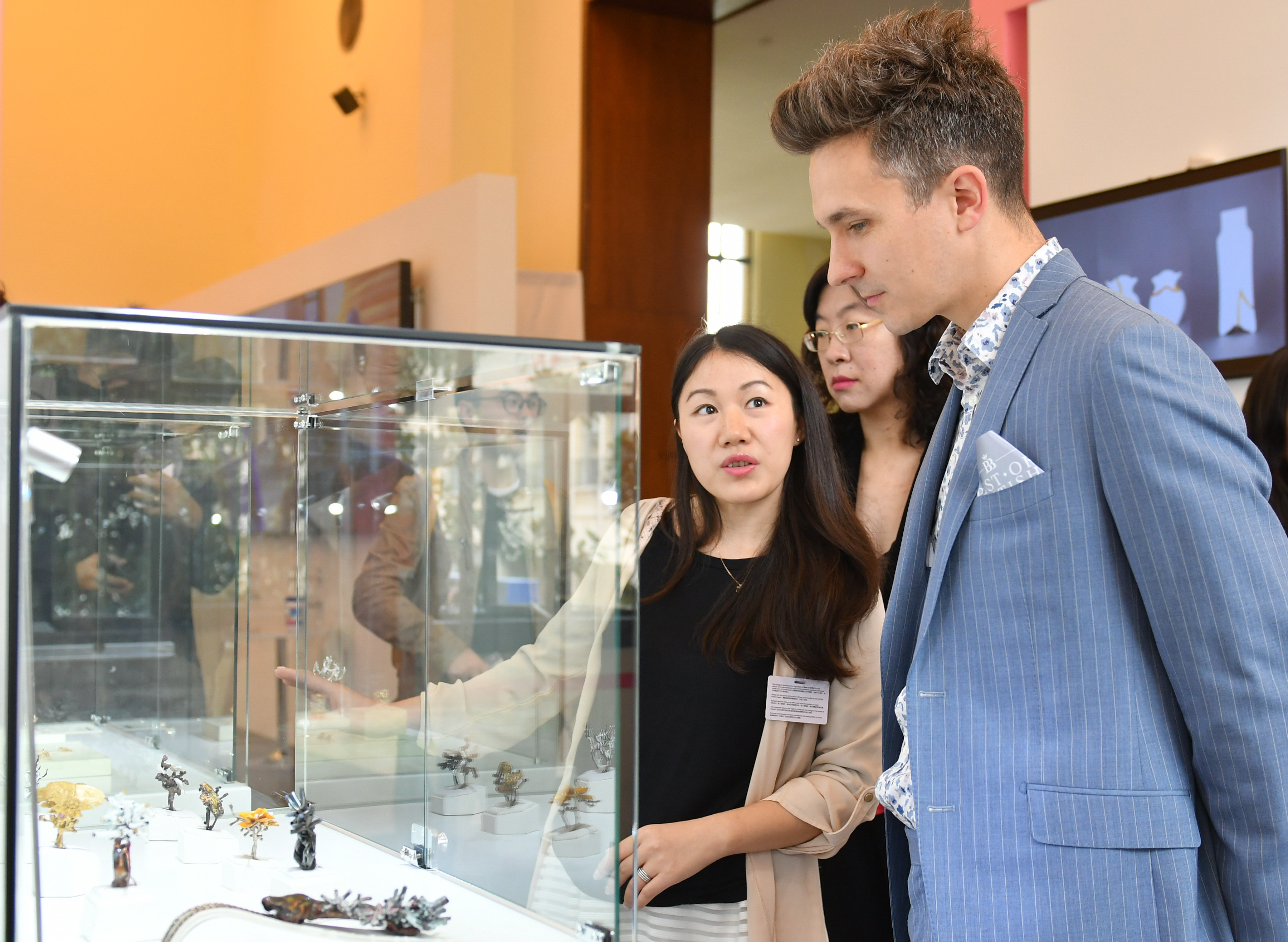 英国校友设计师刘蔓向英国文化教育协会华东区主任Matt介绍作品