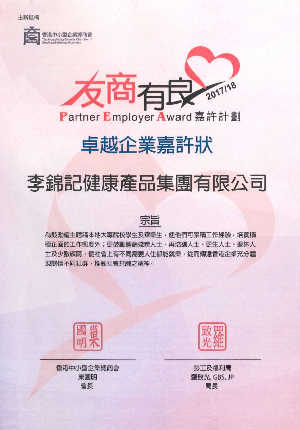 | 图片说明 | 李锦记健康产品集团获香港中小型企业总商会嘉许为2017/18“友商有良”企业。 |