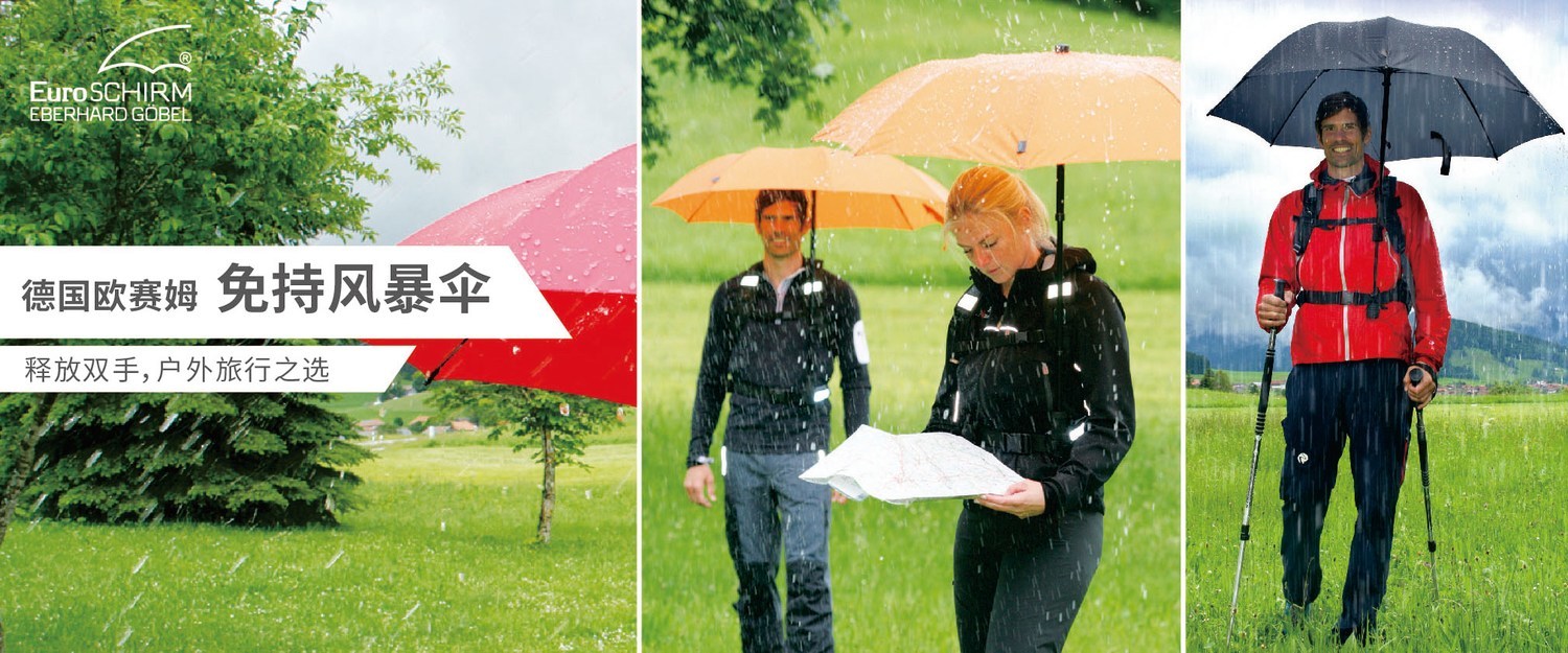 | 图片说明 | 德国欧赛姆手持的“免持风暴伞”, 让打伞时双手彻底获得“解放“,对那些有需求的人,可以方便自如地在烈日下和风雨中,摄影,刷屏,打手机,或干自己想干的事情 |