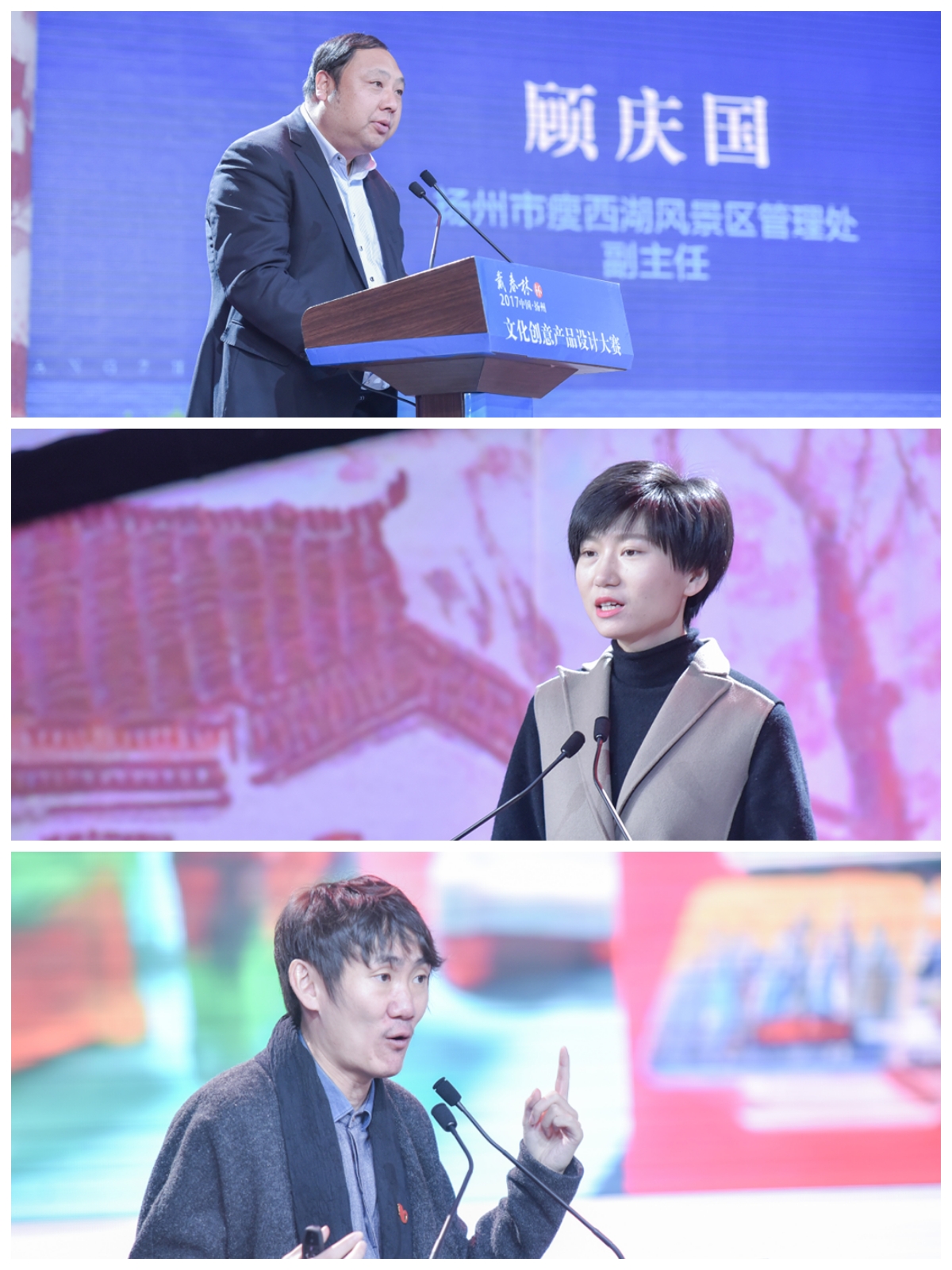图片说明 上图:扬州市瘦西湖风景区管理处副主任顾庆国致辞;中图:扬州戴春林化妆品有限公司副总经理穆青发言;下图:上海天狐上海礼物总经理林海分享创作经验