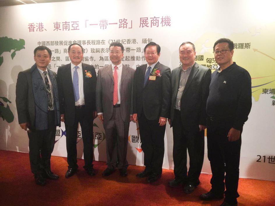 从左至右依次是:诺信董事局主席杨玉斌、四川大陆集团董事长兼总经理杨大陆、香港上市公司环球能源投资集团有限公司董事局主席刘梦熊、中国西部研究与发展促进会理事长程路、中国基金有限公司董事会主席刘学忠、“一带一路”资本融通发展中心副主任谢云发
