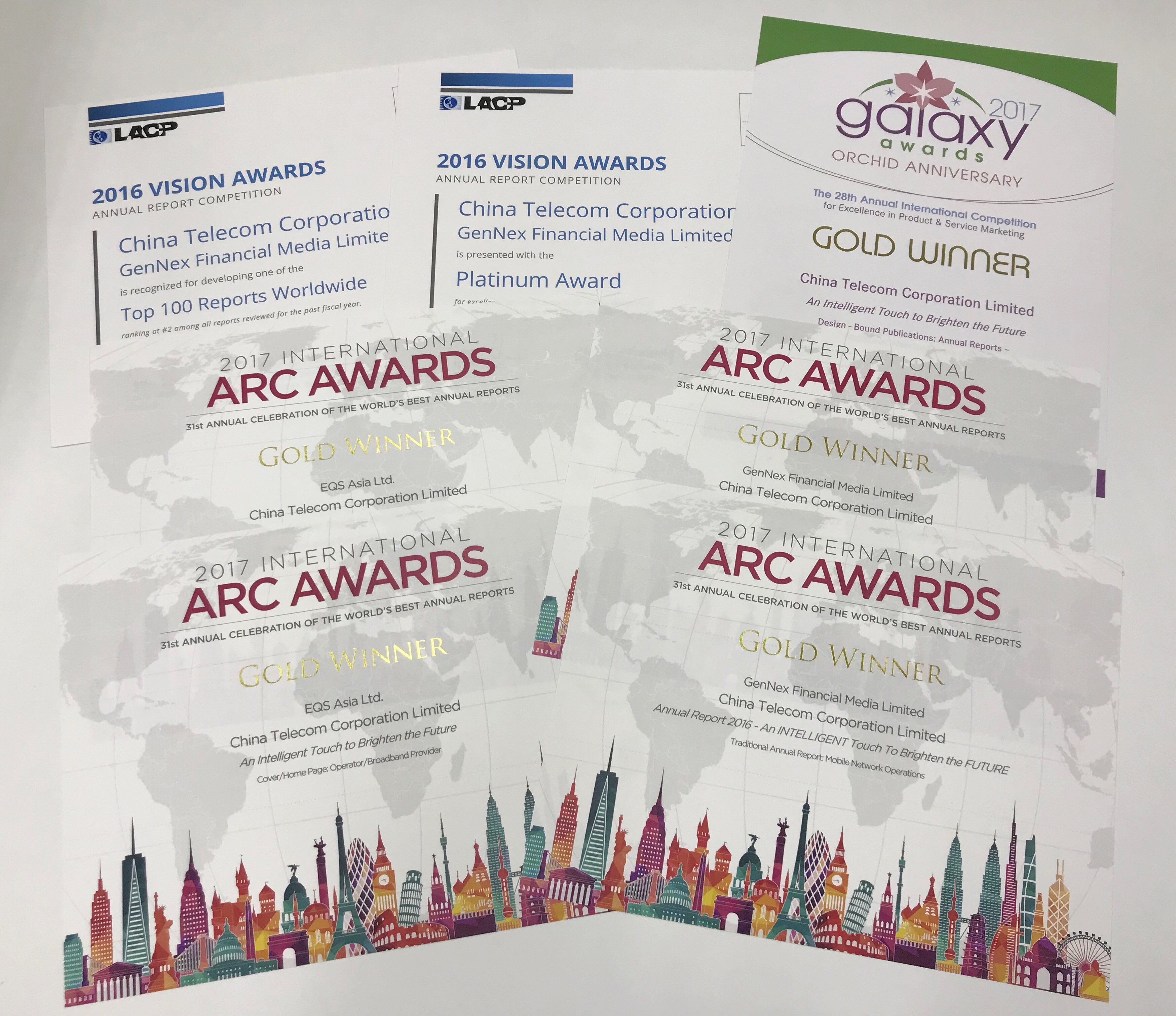 | 图片说明 | 中国电信二零一六年年报于多项世界级比赛中荣获九项顶尖大奖 |
