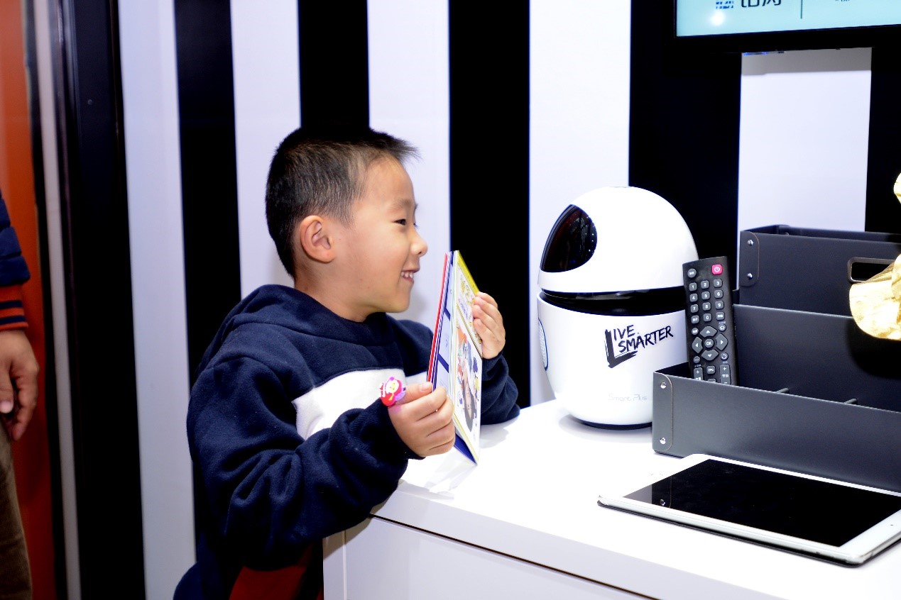 铂涛旅行展厅内,小朋友正在跟智能客房机器人小白聊天