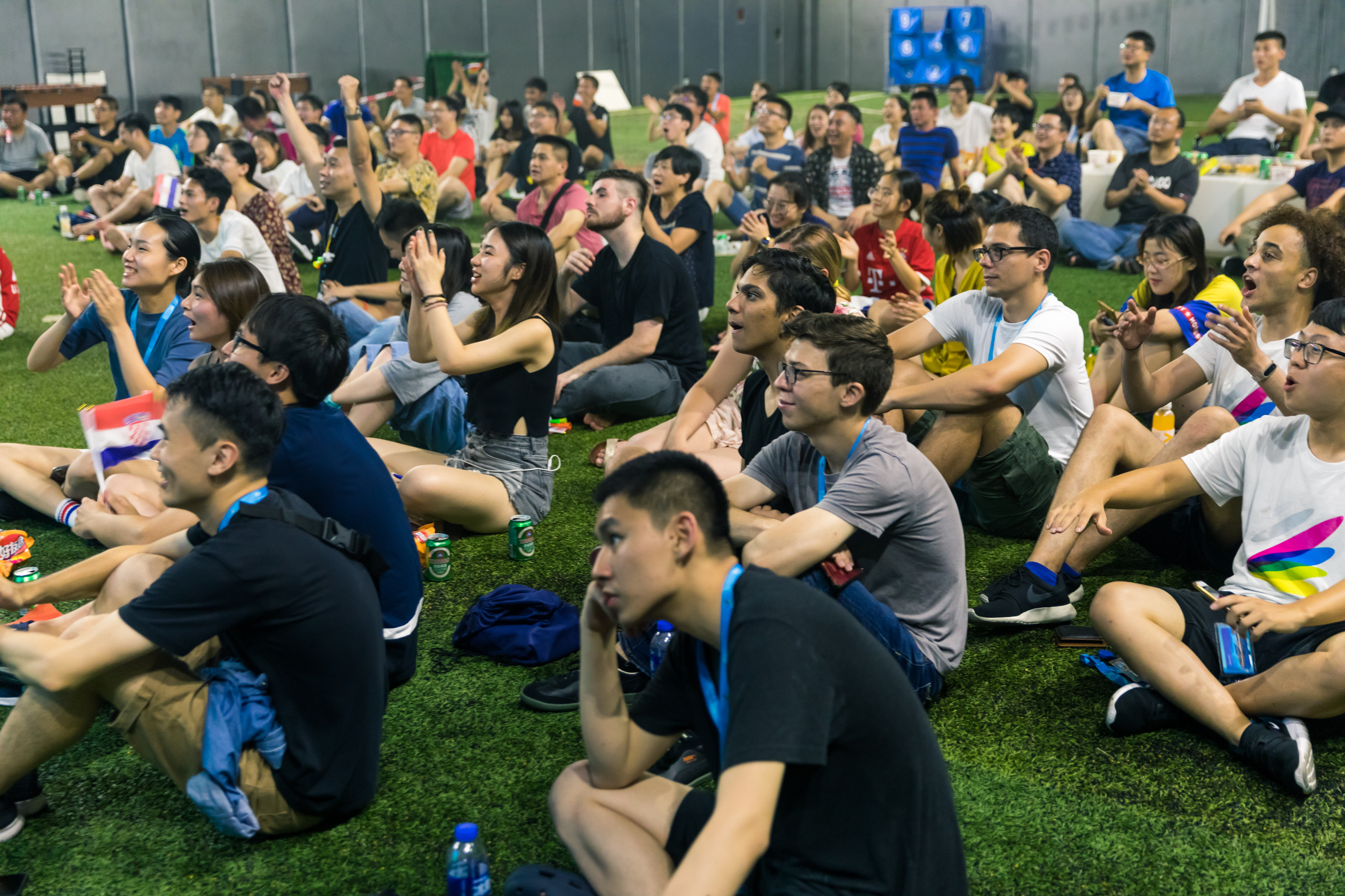 网龙员工与国际实习生在绿茵场上观看世界杯决赛直播