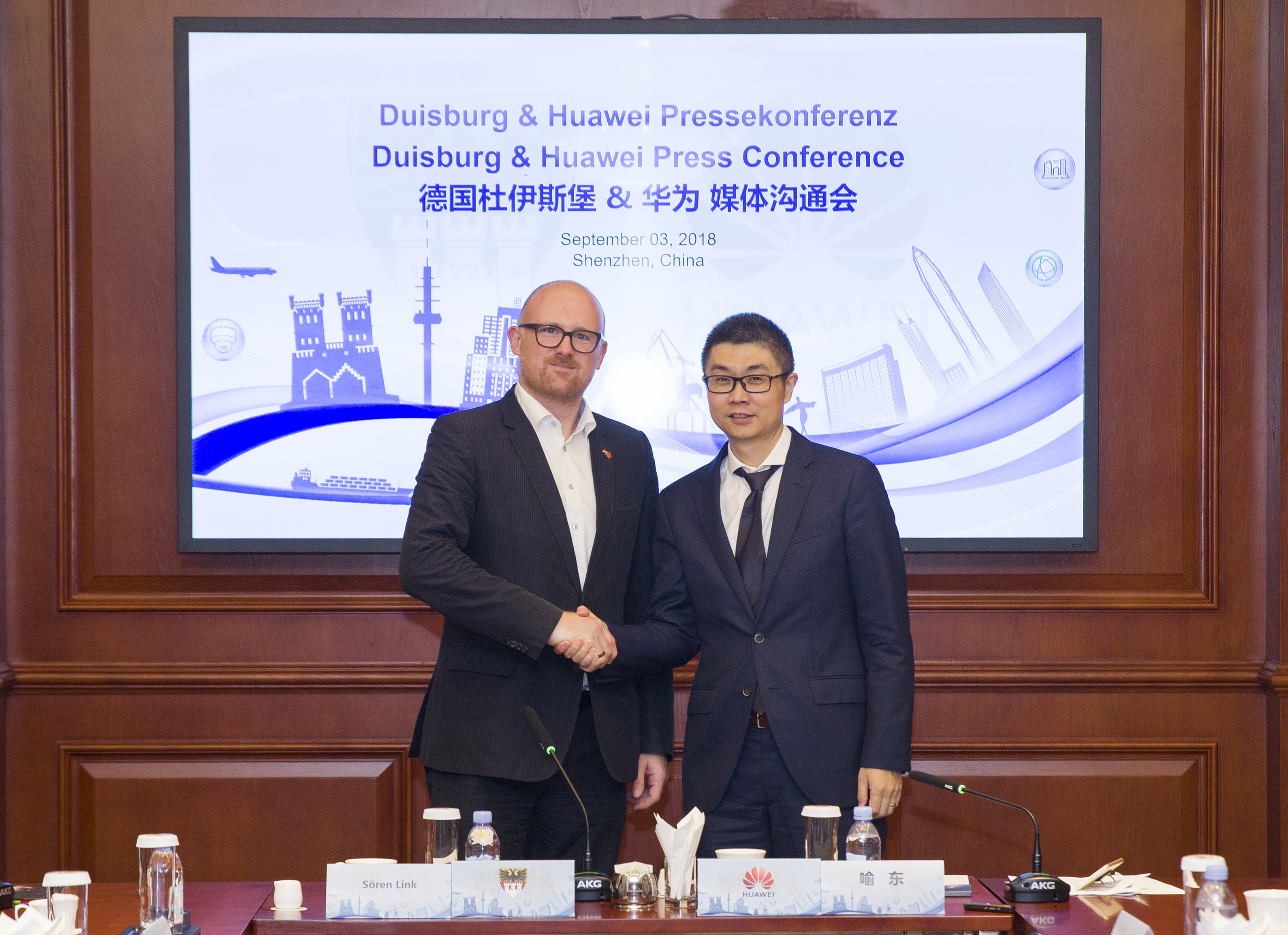 | 图片说明 | 德国杜伊斯堡市长Soren Link(左)与华为企业BG 行业MKT与解决方案总裁喻东 |