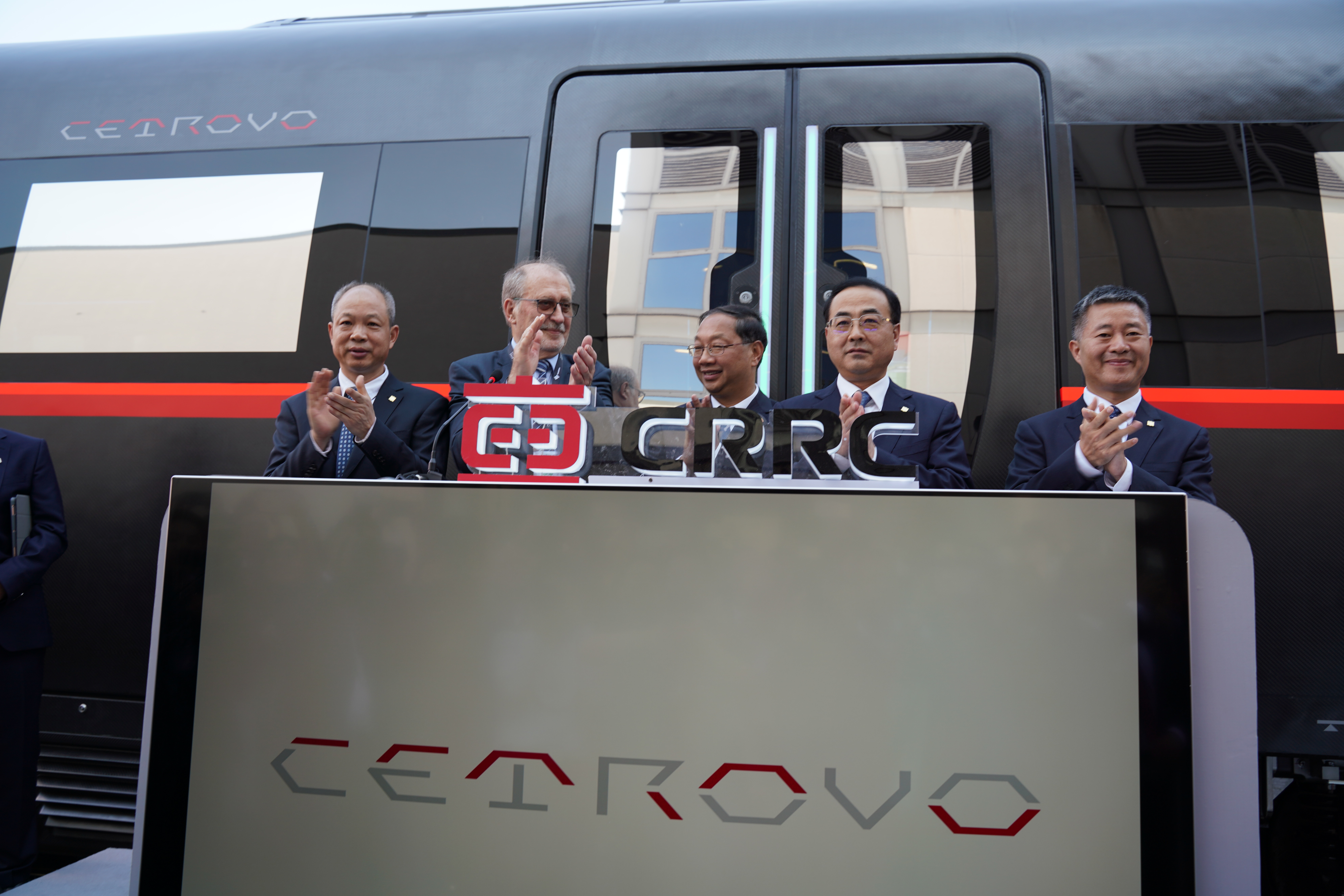 中国驻德国大使史明德,中国中车总裁孙永才、副总裁王军,德国技术专家胡芬·巴赫以及中车四方股份公司总经理马云双见证了中车碳纤维新车型CETROVO的首次亮相