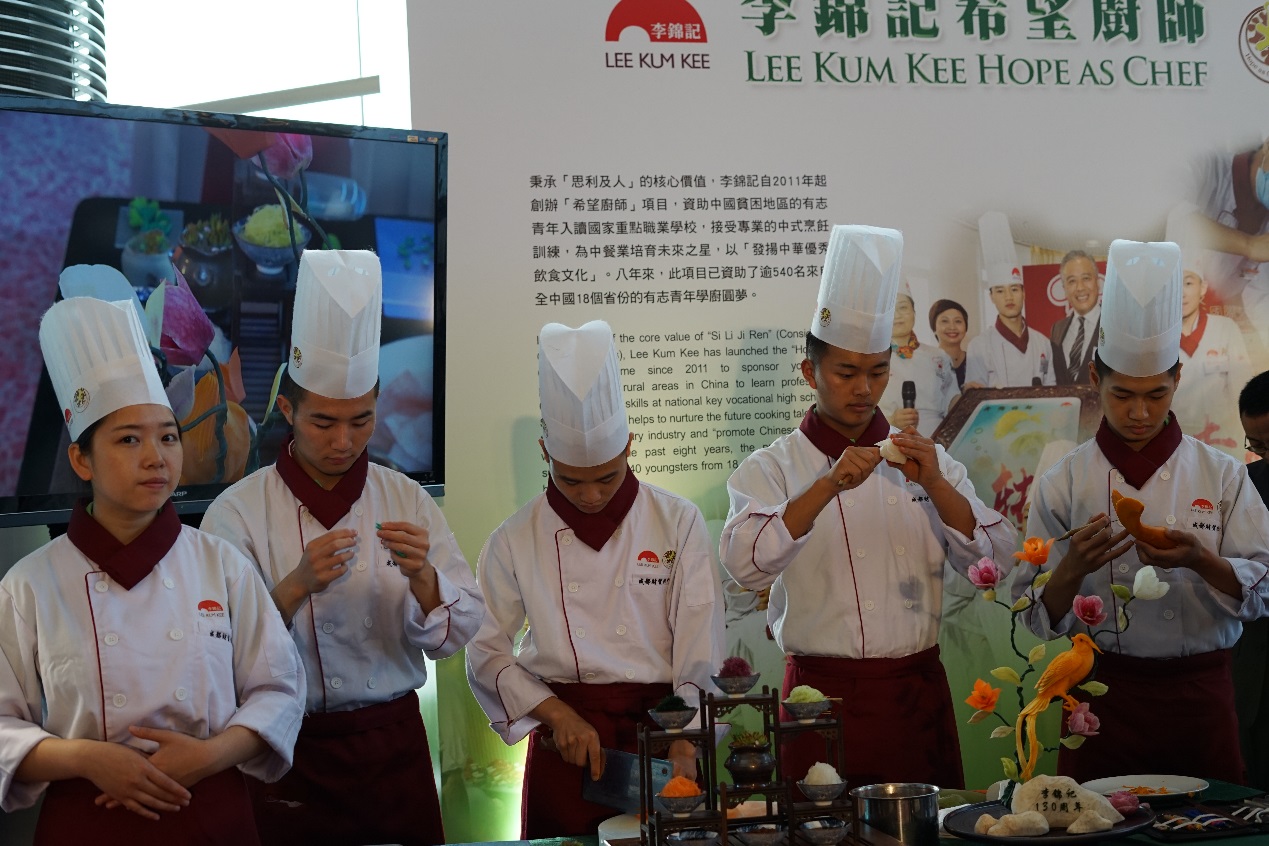 2018年4月,希望厨师古柏宇(右一)在李锦记130周年创业纪念日晚宴上表演