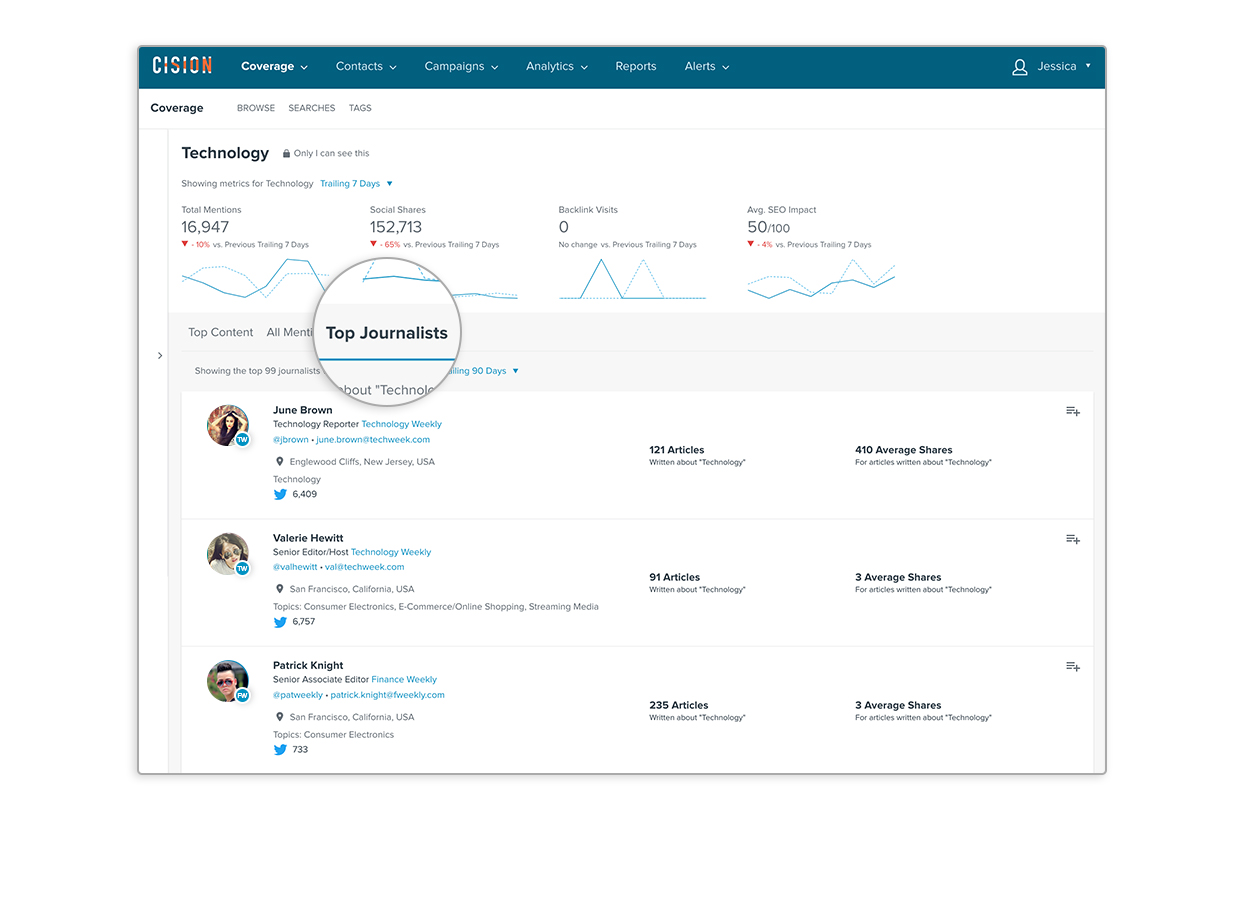 | Caption | Cision Connect is integrated into the Next Gen Cision Communications Cloud, allowing users to instantly surface top journalists and browse complete recent coverage right from influencer profiles. |